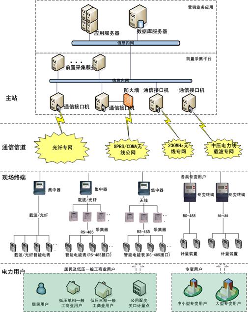 1)主站层又分为营销采集业务应用、前置采集平台、数据库管理三大部分。业务应用实现系统的各种应用业务逻辑;数据采集负责采集终端的用电信息,并负责协议解析;控制执行是对带控制功能的终端执行有关的控制操作;前置通信调度是对各种与终端的远程通信方式进行通信的管理和调度等。